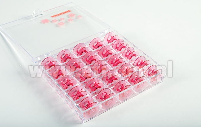 Komplet 25 szpulek plastikowych, płaskich Janome do wieloczynnościowych maszyn do szycia.