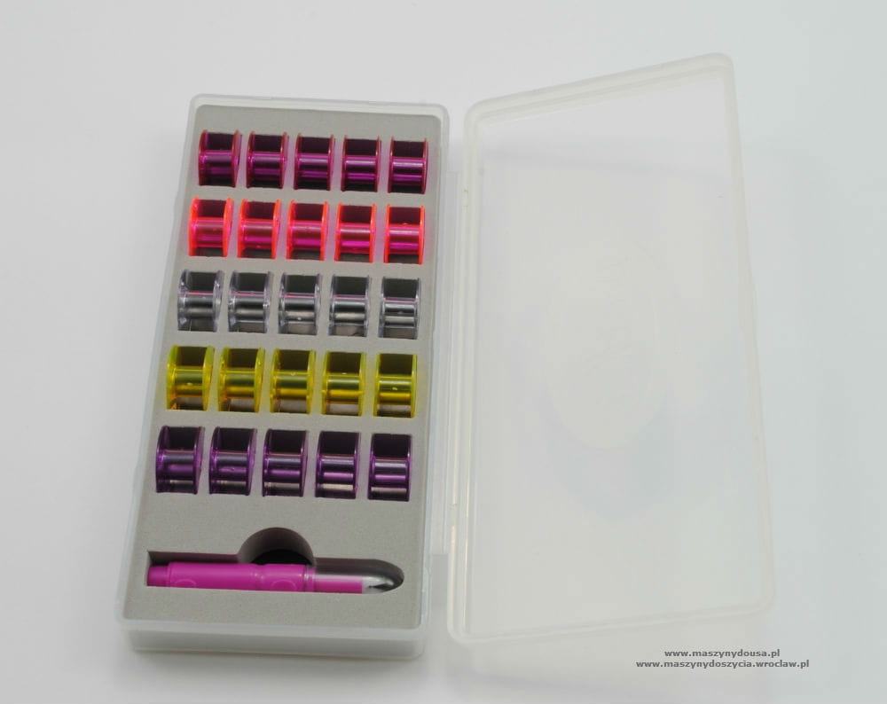 Komplet 25 kolorowych szpulek plastikowych, płaskich do wieloczynnościowych maszyn do szycia w eleganckim opakowaniu w zestawie automatyczny nawlekacz nici w igłę.