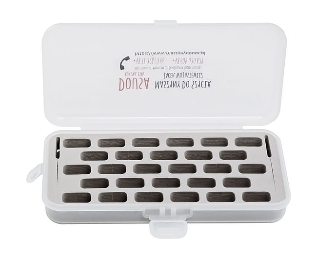 Przybornik na 28 szpulek do maszyny + 2 nawlekacze. Przybornik jest świetnym pojemnikiem na szpulki, opakowanie jest solidne i trwałe.