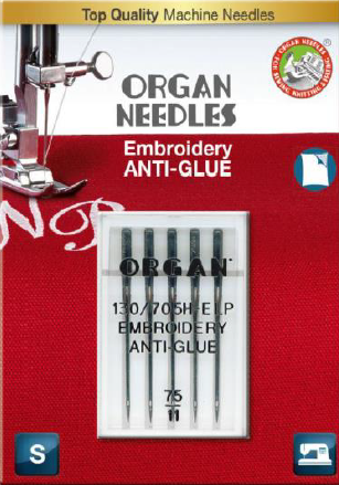 Igły ANTI-GLUE mają specjalistyczną powłokę. To gwarantuje wolne od zakłóceń przesuwne haftów w połączeniu z matami samoprzylepnymi i klejami tymczasowymi. Kleje nie przyklejają się do igły dzięki czemu nie zatykają otworu na nici. Zmniejszają tym samym możliwość pominięcia szwów.