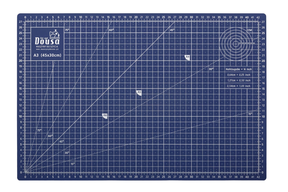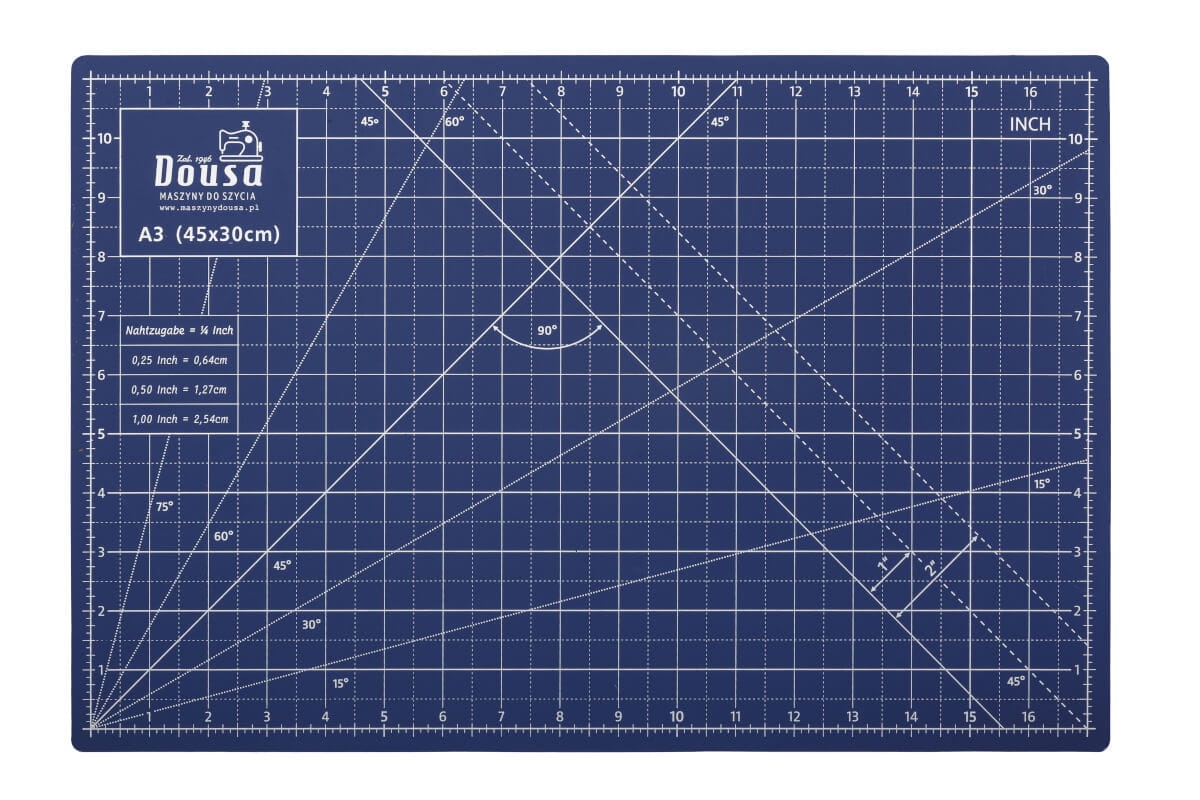 Mata samogojąca w kolorze niebieskim z zaznaczonymi kątami i liniami równoległymi. Wykonana jest ze specjalnego tworzywa, które po cięciu samo się zasklepia, pozostawiając matę wciąż gładką.