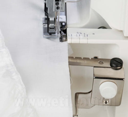 Specjalny prowadnik do marszczenia jednej warstwy materiału przy jednoczesnym doszywaniu drugiej i obrzucaniu brzegu.
