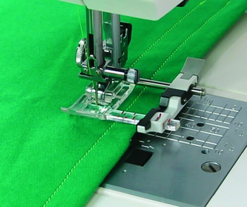 Regulowany prowadnik umożliwia swobodnie wykonanie przeszyć od 1 cm do nawet 3 cm od krawędzi materiału. Dodatkowo przy prowadniku jest specjalne zabezpieczenie, które uniemożliwia przesunięcie go w trakcie szycia. Stopka jest prosta w montażu.