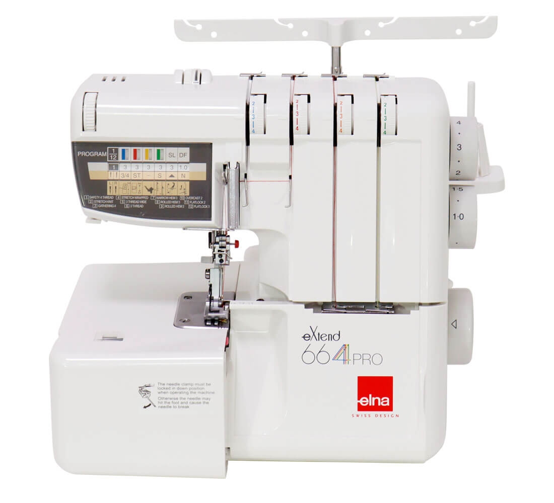 Model 664 PRO wyróżnia charakterystyczny programator, który pomaga w doborze odpowiednich ustawień dla poszczególnych typów ściegów. Znacznie ułatwia to obsługę urządzenia, podobnie jak zastosowane barwne oznaczenia sposobu nawlekania. Maszyna pracuje z maksymalną prędkością 1300 wkłuć na minutę. Owerlok jest wyposażony w różnicowy mechanizm transportu oraz regulację docisku stopki, by ułatwić szycie skrajnie cienkich i grubych materiałów. Ciekawym rozwiązaniem jest możliwość odchylania uchwytu mocującego igły, dla ułatwienia ich wymiany.
