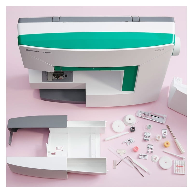 Maszyna do szycia Husqvarna Viking Jade 20 ma w obudowie wygodny obcinacz nici. Pole pracy jest oświetlone precyzyjną lampką LED. Do maszyny domowej Husqvarna Jade 20 dołączono wyjątkowy i bardzo praktyczny pojemnik na akcesoria. Dzięki niemu dołączone do maszyny dodatki będą zawsze uporządkowane i zawsze pod ręką. Pojemnik na akcesoria, założony na maszynę tworzy z nią estetyczną zamkniętą bryłę.