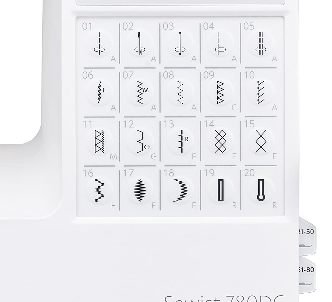Model Sewist 780DC to trwała maszyna z szeregiem automatycznych funkcji sprawiających, że obsługa maszyny jest znacznie bardziej komfortowa. Urządzenie posiada 80 ściegów m.in. ze ścieg prosty, zygzak, ściegi elastyczne, ścieg kryty, owerlokowy oraz ściegi dekoracyjne. 20 przycisków z przodu maszyny pozwala na szybkie przełączanie się na najczęściej stosowane ściegi. Tuż obok nich możemy wysunąć tabliczki ze wszystkimi dostępnymi ściegami.