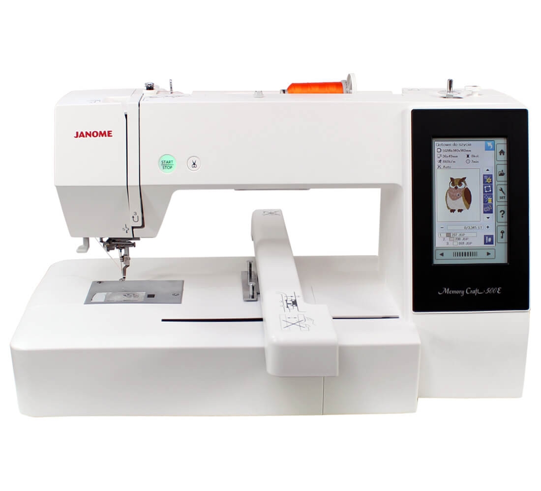 Maszyna haftująca Janome Memory Craft 500 E to nowoczesne i intuicyjne urządzenie o maksymalnym polu haftu 280 x 200 mm. Obsługa hafciarki jest bardzo łatwa, dzięki dużemu i czytelnemu ekranowi oraz menu w języku polskim. Spośród 160 dostępnych wzorów wystarczy wybrać haft, jednym przyciskiem połączyć go z napisami (do wyboru 6 różnych czcionek: 3 europejskie z polskimi znakami oraz 3 cyrlice), nacisnąć start na hafciarce i wyhaftować. Proste, prawda? Jeżeli dostępne hafty nie będą wystarczające można za pomocą pendriva przenieść nowe wzory do pamięci hafciarki (posiada wbudowany port USB).