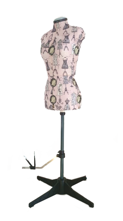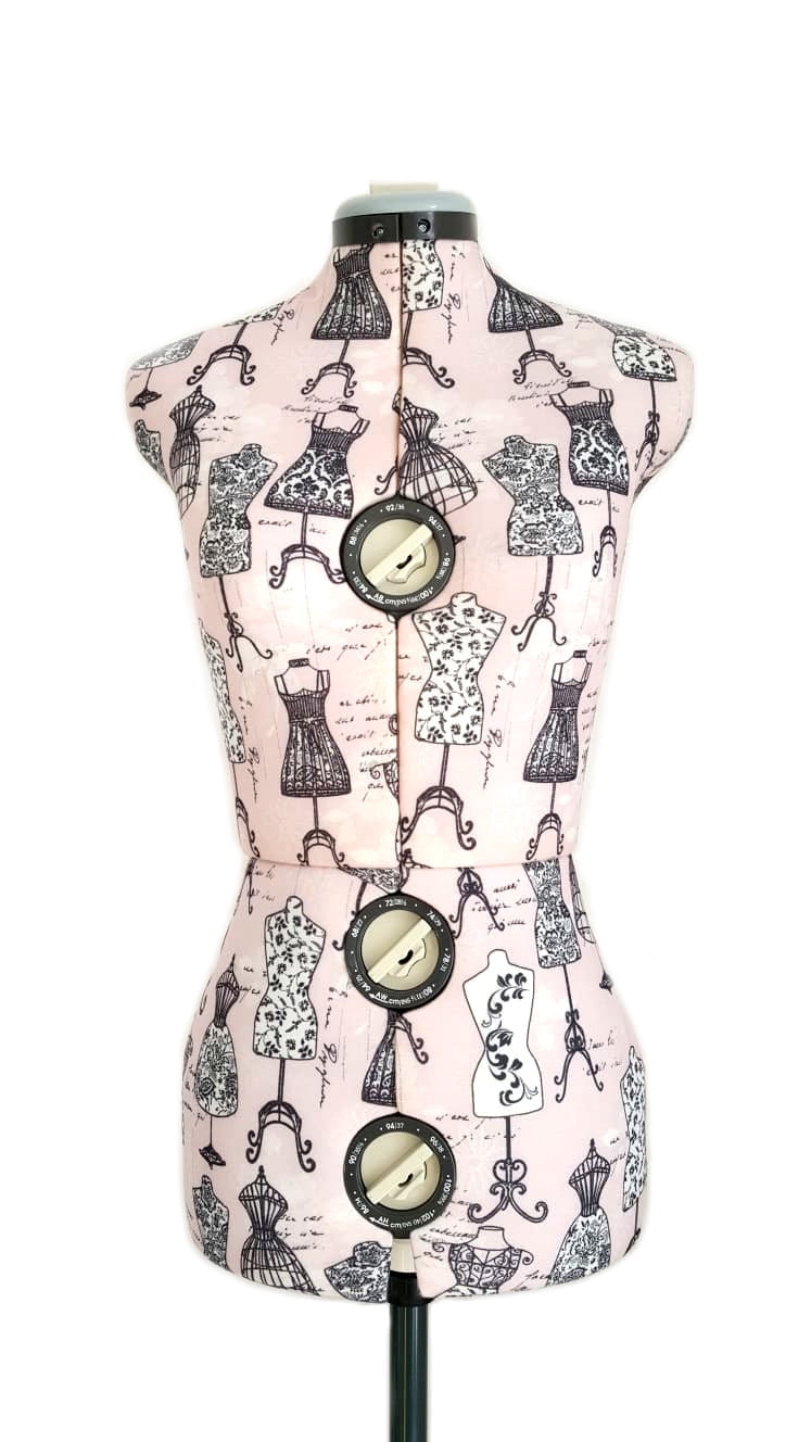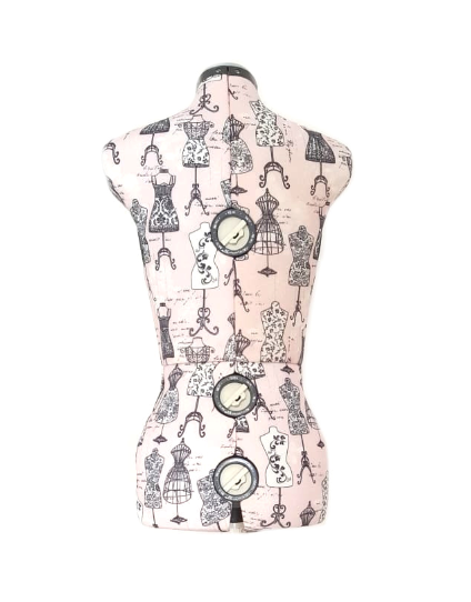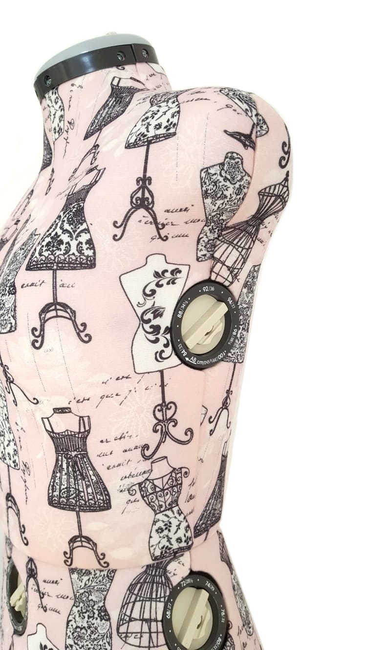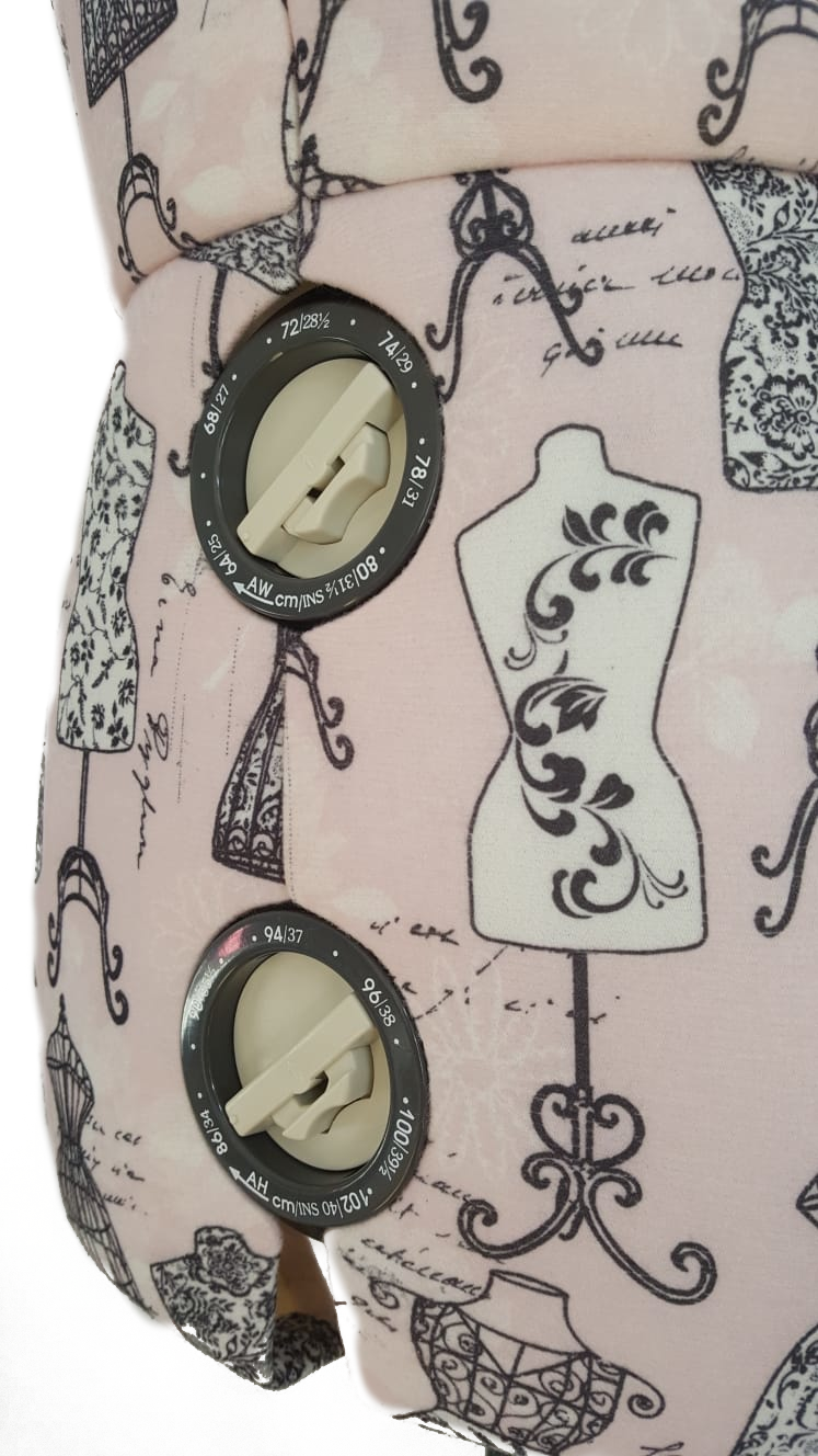 Ciekawy kolorowy wzór z grafikami w stylu retro. Jasny kolor, odcień różowego. Manekin bardzo prosty w montażu i obsłudze. Obudowa manekina jest wykonana z plastiku, na nią została położona pianka, która została powleczona materiałem. Opiankowanie manekina umożliwia łatwe wbijanie szpilek.