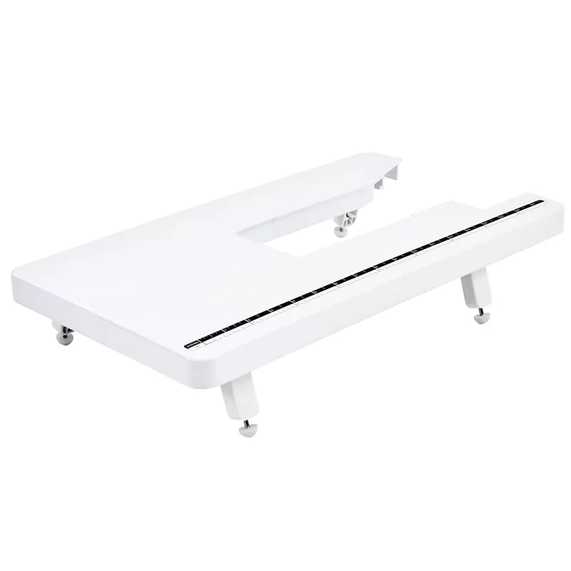 Stolik powiększający pole pracy jest bardzo pomocny zwłaszcza podczas szycia dużych elementów. Gdy użyjesz stolika wygodniej uszyjesz pościele, narzuty na łóżka, koce, kurtki czy płaszcze. Podczas szycia materiał nie będzie zsuwał się z maszyny, a gumowe nóżki stolika nadadzą stabilności. Stolik przechowasz na małej powierzchni, gdyż nóżki składają się. Dodatkowo pracę usprawnia linijka umieszczona na stoliku.