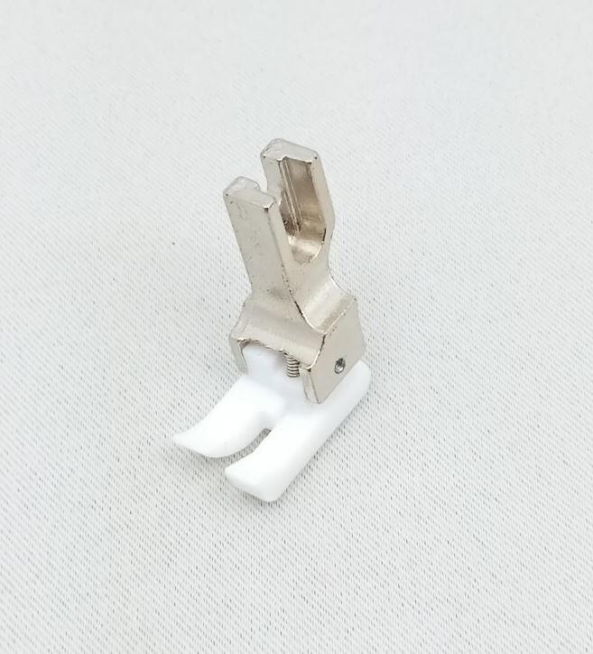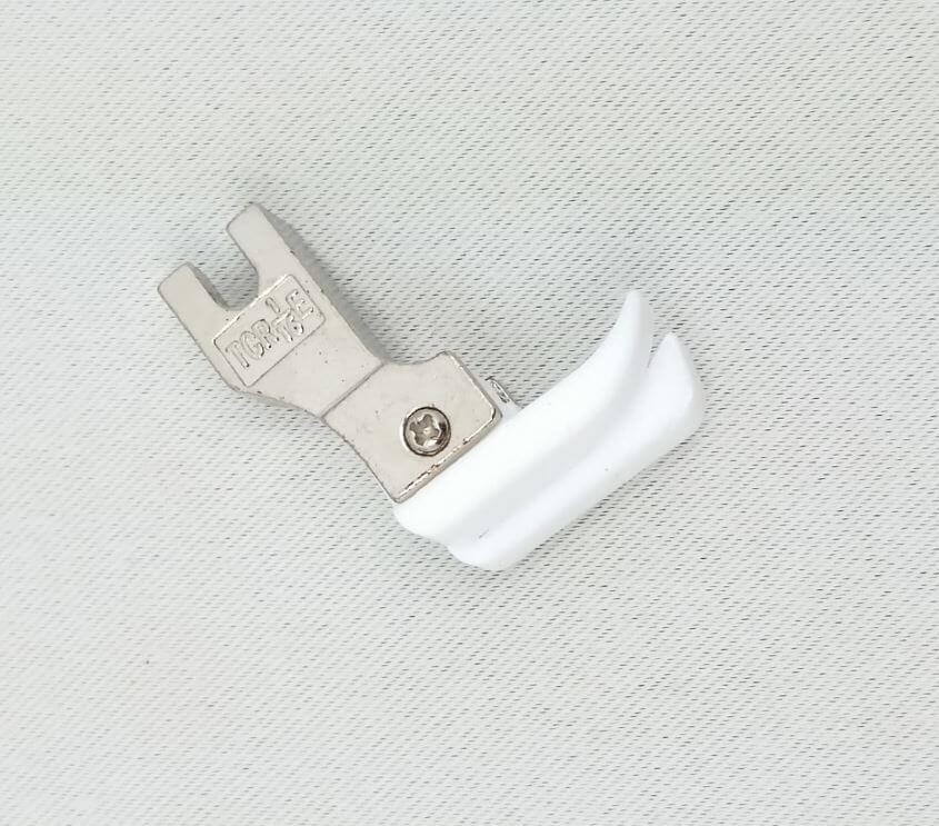 Stopka kompensacyjna prawa z ruchomą płozą przeznaczona do przemysłowych maszyn do szycia z transportem ząbkowym. Stopka krawędziowa (kantówka prawa) nie pasuje do maszyn domowych i przemysłowych z górnym transportem. Płoza została wykonana z teflonu, co ułatwia szycie trudnych materiałów, np. skóropodobnych.