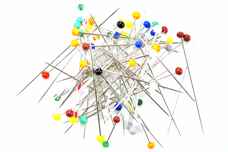 Szpilki o długości 34 milimetrów. Stalowe, niklowane z okrągłą, kolorową szklaną główką. Mix kolorów.