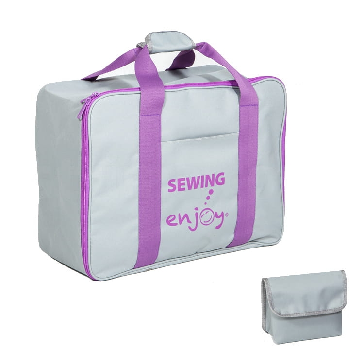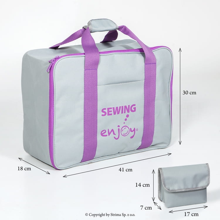 Torba na domową maszynę do szycia "enjoy sewing". Szaro-fioletowa, idealna do przechowywania lub transportu maszyn do szycia. Duża, otwierana na zamek komora ułatwia pakowanie i wyjmowanie maszyny z torby. Wszyte, utwardzone dno nadaje torbie dodatkową stabilność. Dodatkowo na rączkach torby znajduje się miękki uchwyt na rzep do noszenia torby w ręce. Pasuje do większości domowych maszyn do szycia dostępnych na rynku. Wyposażona w saszetkę idealną do przechowywania akcesoriów.