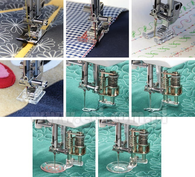 - dwie przystawki transparentnen idealne do pikowania nierównych powierzchni. Linie na stopce ułatwiają równomierne pikowanie. Te przystawki są szczególnie przydatna podczas pikowania techniką echo.