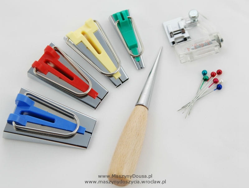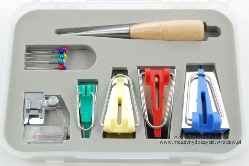 Dzięki niemu możemy sami przygotować lamówkę i zaprasować ją żelazkiem. Wystarczy, że utniemy taśmę materiału pod kątem 45 stopni, włożymy do zwijacza, przeciągniemy przez niego, a następnie zaprasowujemy przeciągnięty materiał. Dzięki czemu w łatwy sposób wykonamy lamówkę dokładnie z tego materiału, do którego potrzebujemy lamówki. Komplet składa się również z lamownika, dzięki któremu od razu wszyjesz przygotowaną lamówkę.